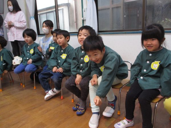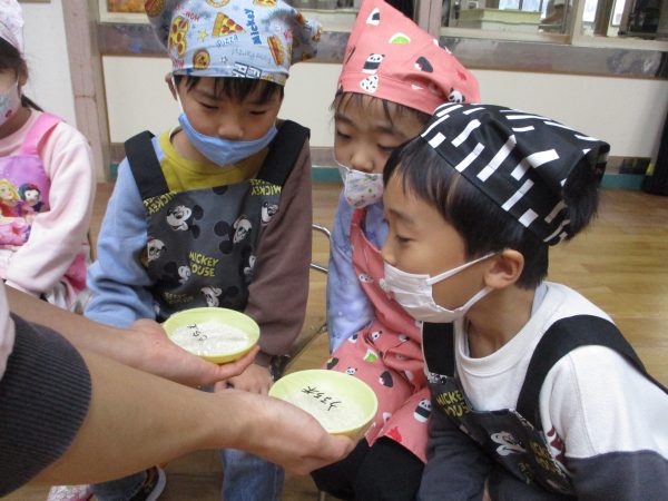 初めにお米の違いの話を聞いたり、近藤さんたちにインタビューをしたりしました。「美味しいお餅をつくコツはなんですか?」と質問してコツを聞いたらもちつきスタート✨間近で見ると迫力満点!「よいしょ~!」「がんばれ~!!」と応援にも力が入りました💪らいおん組さんは、重たい杵を持っておもちつきを頑張りました。「重かった!」「楽しかった!」と感想が聞こえてきました😊