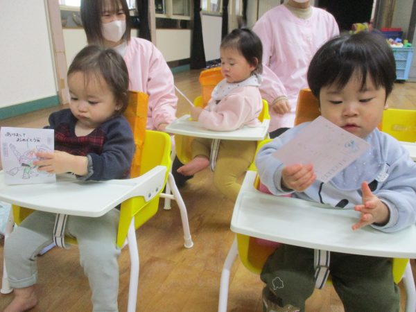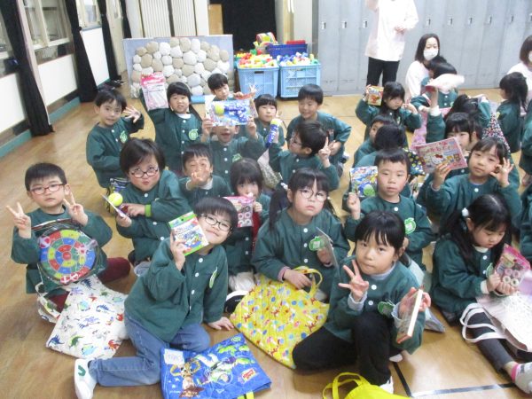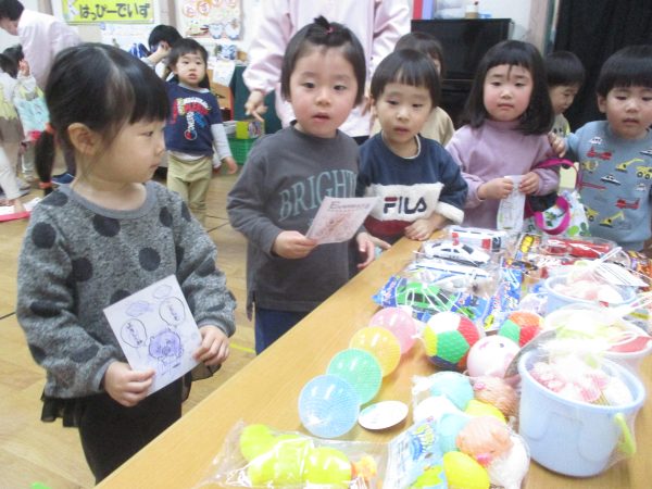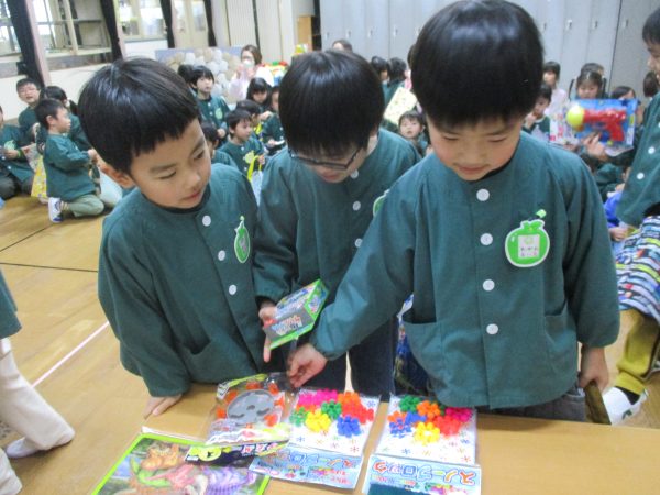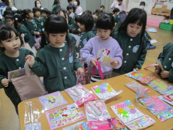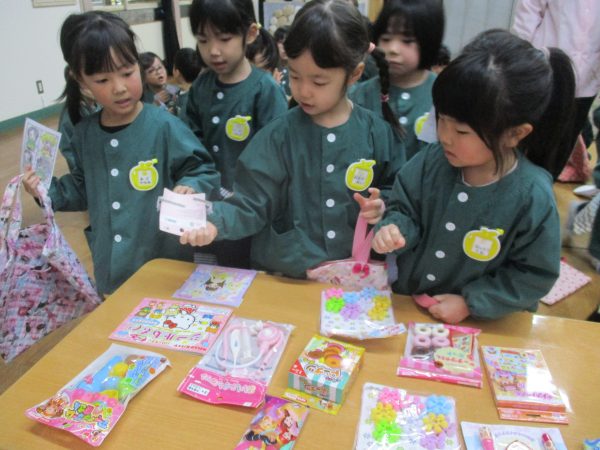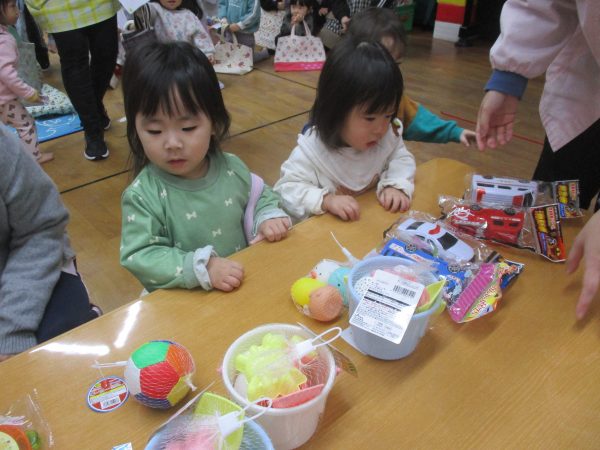 郵便ごっこでお友だちにもらったはがきの中からシール付きはがきを持って遊戯室に集合しました😊当たりが出るのを目をキラキラさせ、ドキドキしながら待っていた子どもたち♬自分のはがきが当選すると大喜びで景品を選んでいました✨
