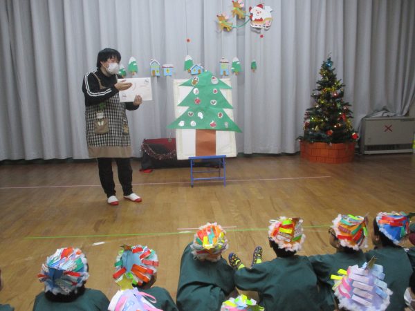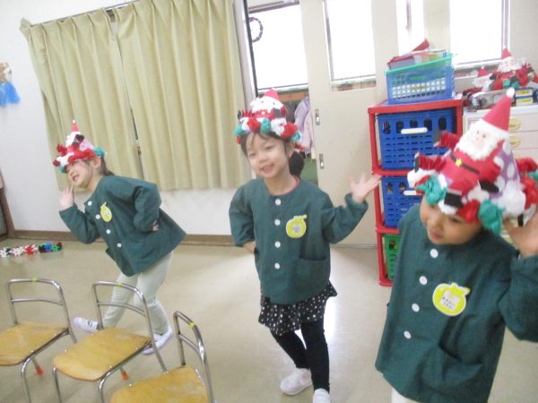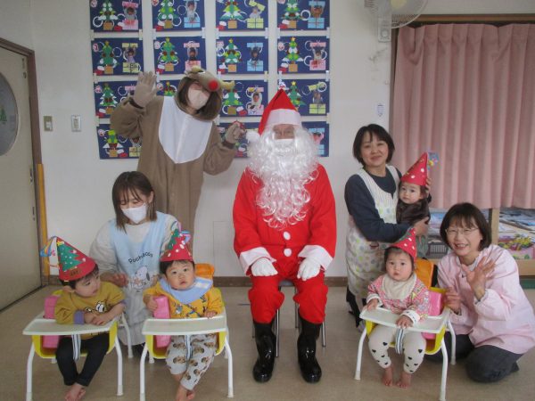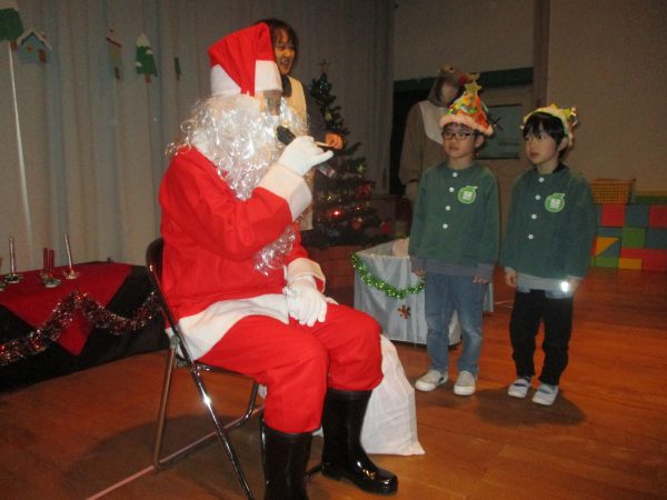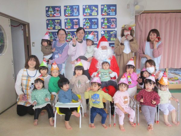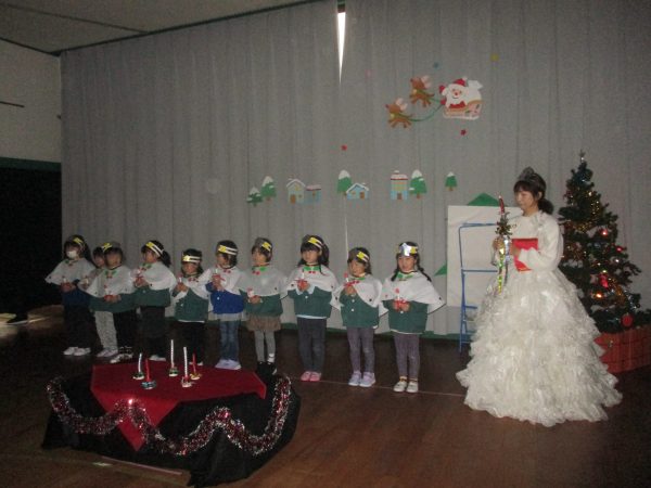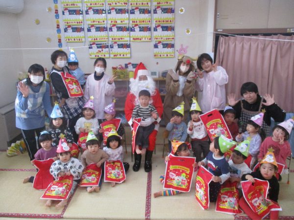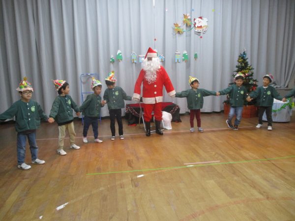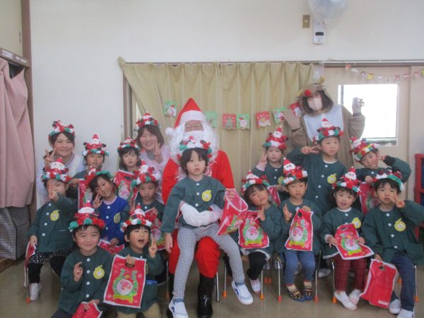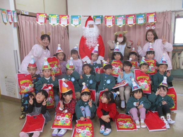 12月24日(水)クリスマス会が行なわれました。今年は、インフルエンザ流行のため各クラスで行いました。らいおん組女の子が火の精になりキャンドルサービスからスタート✨おはなしを聞いたり、みんなでフォークダンスを踊たりと楽しい時間を過ごしました。サンタさんがプレゼントを持って、それぞれのお部屋に登場した時は大喜び!!1人ずつプレゼントをもらったり、一緒に写真を撮ったりとニコニコ笑顔のみんなでした♬