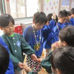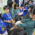 12月24日(火)、クリスマス会がありました。子ども達は数日前から「早くクリスマスにならないかな~!」と楽しみにしていました。らいおん組の女の子が火の精になり、キャンドルサービスをしてもらいクリスマス会がスタートしました。サンタさんが登場すると子ども達は大喜び!!一緒に歌をうたったり、ダンスを踊ったり、サンタさんへの質問をしたりして楽しく過ごしました。最後にサンタさんから一人ずつプレゼントをもらい、笑顔いっぱいの子ども達でした(#^^#)