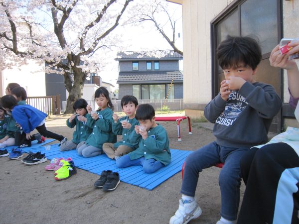 給食は、ぞう組とらいおん組がお遊戯室で会食をおこないました。きな粉もちと、お雑煮がとっても美味しくておかわりも沢山していました!みんなで会食、楽しかったね(^^)/