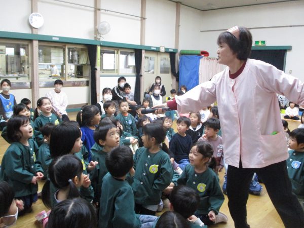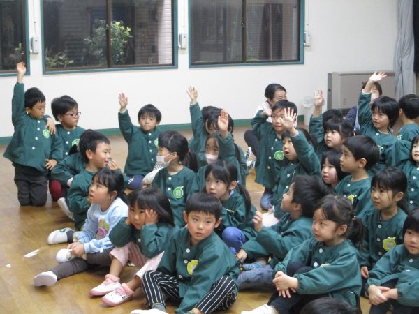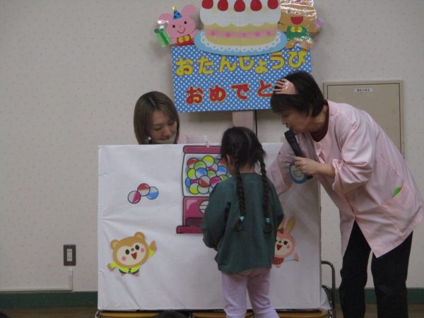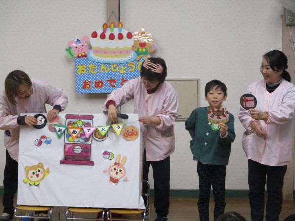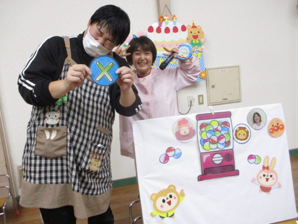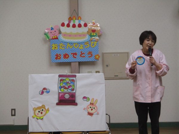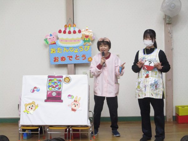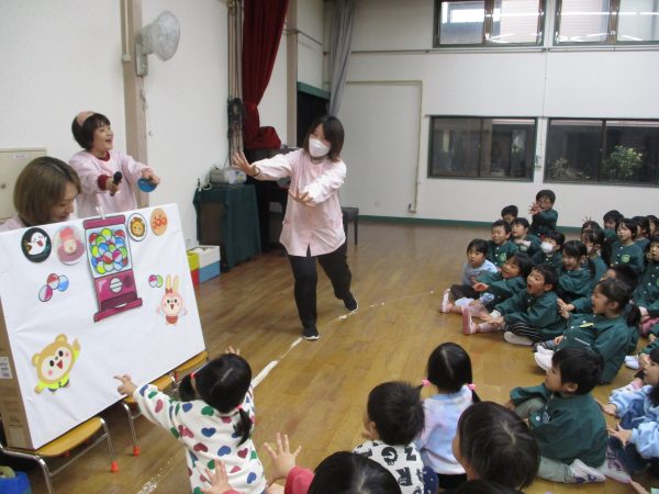 今月のシアターはガチャガチャクイズを楽しみました。お金を入れるとカプセルが出てくる、みんな大好きなガチャガチャ♪カプセルの中には何が入っているかな?クイズ形式でみんなで盛り上がりました♪