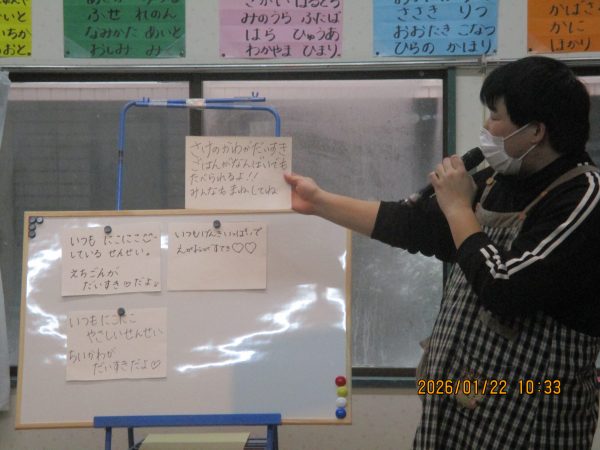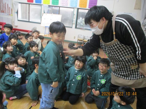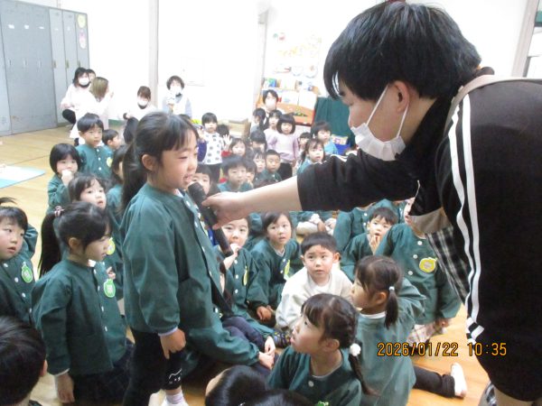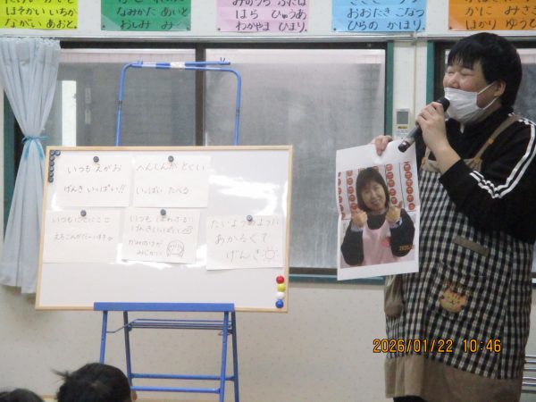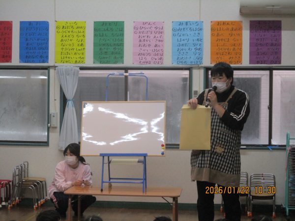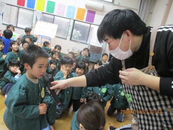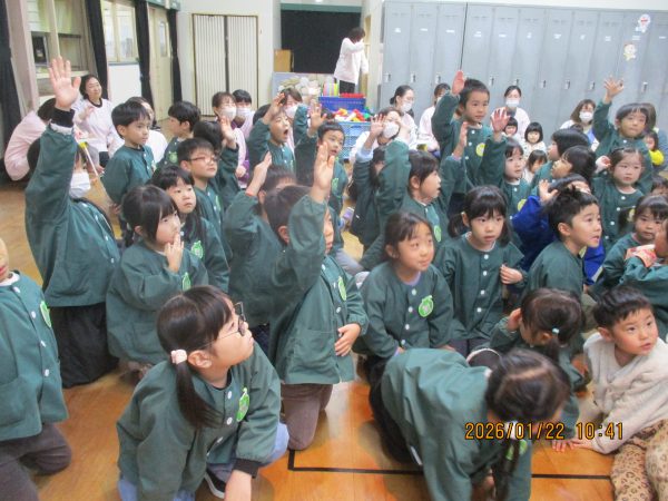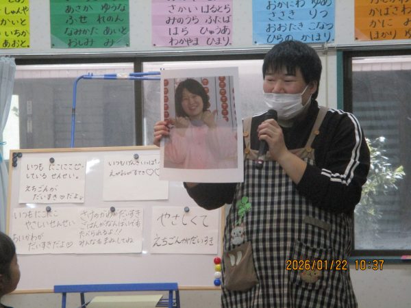 袋の中から出てくる様々なヒントを聞いて、どの先生のことなのかをよ~く考えて答えていた子どもたち(*^-^*)次々に出てくるヒントを聞いては、左右や後ろを向いて先生たちの姿を確認したり、「○○先生だ!」と大好きな先生の名前を呼んだりして、クイズを楽しんでいました♪