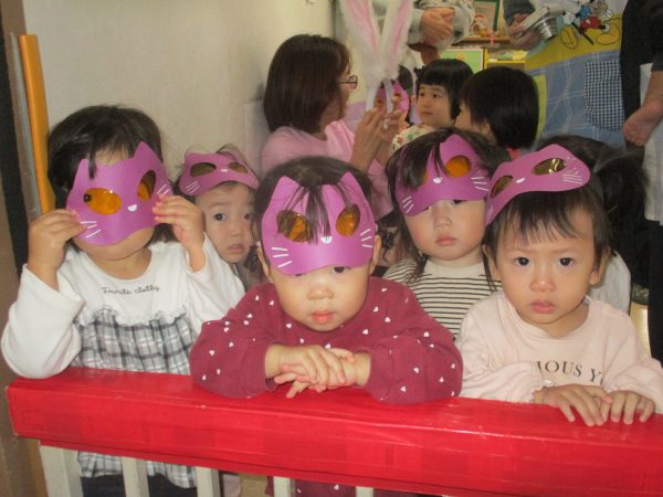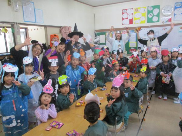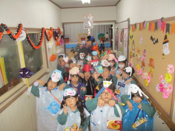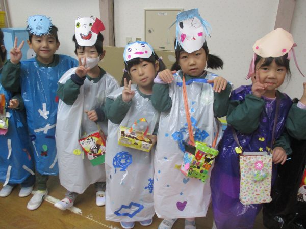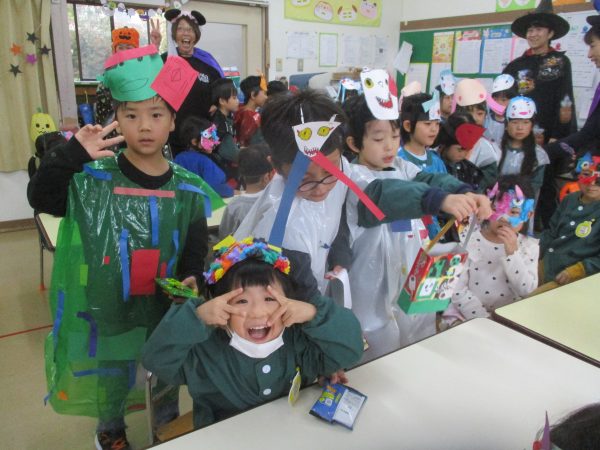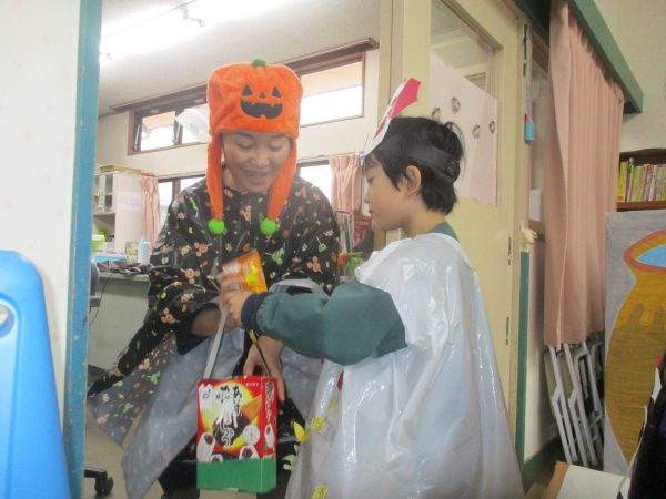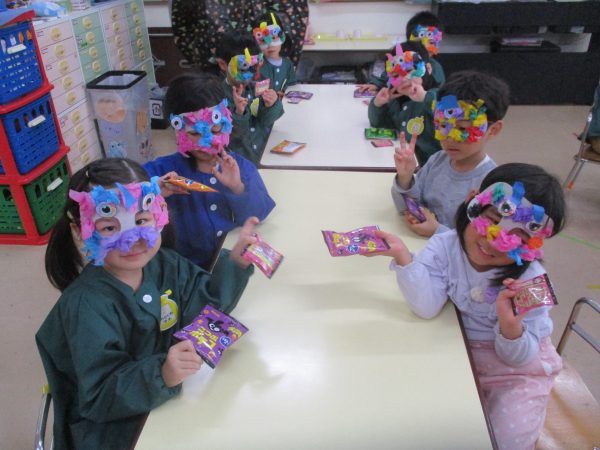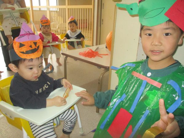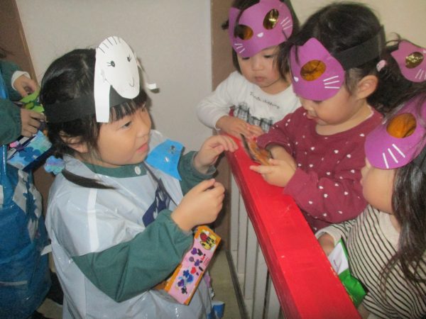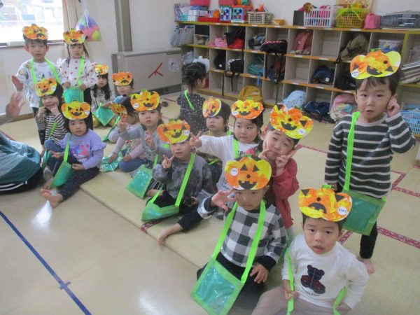 10/31(金)にハロウィンごっこを行い、らいおん組が様々なオバケに仮装して各クラスにお菓子を配ってくれました!他のクラスの子どもたちも手作りのお面を被って参加し「ハッピーハロウィン!」「トリック・オア・トリート!」と声を掛けながら、盛り上げてくれました(*^-^*)